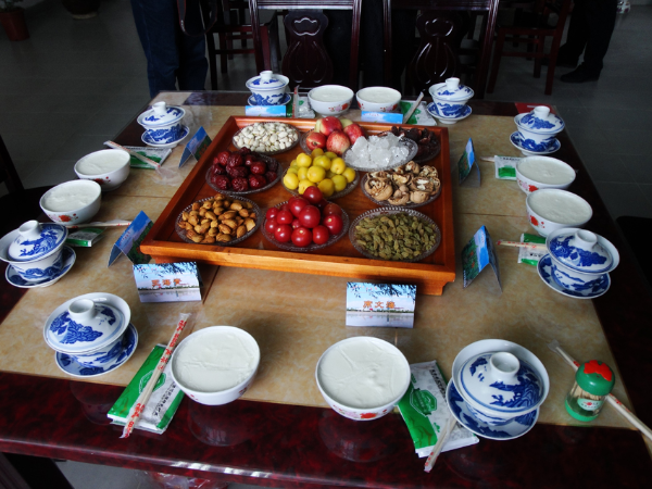 回族普遍喜歡飲茶?;刈逑让裣彩程鹌?,在中國茶文化影響下,形成了以甜味為特色的飲茶習慣。飲茶之風興起于中國晉代,盛于唐代以后,隨之出現(xiàn)了茶具,其中以包括茶托、茶碗、碗蓋的“三坯胎”蓋碗美觀實用?;刈謇^承發(fā)展了這種茶文化,形成了以“三炮臺”為茶具的“八寶蓋碗茶”:在茶具中放入茶葉(茉莉花茶、陜青茶、紅磚茶、窩窩茶、毛尖等)、糖(白糖、紅糖、冰糖、梨膏糖等)及紅棗、核桃仁、桂圓肉、芝麻、葡萄干、枸杞(或柿餅、山楂、姜片、果干)等配料,用開水沖制后飲用。茶葉及配料在不同的地區(qū)、不同的季節(jié),根據(jù)飲茶者的身體狀況與喜好有不同的搭配,如“紅糖磚茶”“冰糖陜青茶”“三香茶”(茶葉、糖、桂圓)、“白四品”(陜青茶、白糖、柿餅、紅棗)、“紅四品”(磚茶、紅糖、紅棗、果干)、“五味茶”(綠茶、山楂、芝麻、姜片)等。八寶茶具有生津解渴、開胃健脾的作用,放入不同的茶料,又具備了不同的健身康體功能。