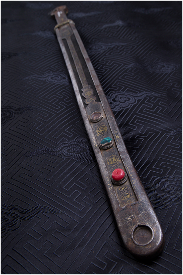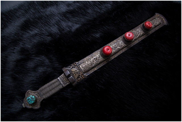 安多地區(qū)主要以放牧為主,牧民的刀主要用于宰殺和吃肉,有嚴(yán)格的男用女用之分,男式刀長度在一尺以上,女式刀在一乍左右,刀鞘的底部和刀柄的末端上翹,呈船形。安多人喜歡珠寶,頭飾、胸飾、腰飾無不光燦耀人,這些飾物同樣被用在刀上,刀鞘和刀柄錨金錯(cuò)銀,鑲嵌著珊瑚和綠松石,像精美的藝術(shù)品。