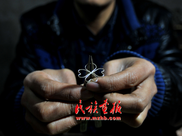 將事先手工打磨好的銀絲擺放在需要鑲嵌的位置,然后用焊槍整體加溫。該過(guò)程需要嚴(yán)格控制溫度,溫度高則熔斷銀絲,溫度低則鑲嵌不牢固。制作過(guò)程最難把握的是鏨刻與焊接。鏨刻的掌握全憑手上的感覺(jué),用力過(guò)大容易將銀片鏨通,力道不夠又不能將紋理的層次感突顯,這是檢驗(yàn)一個(gè)銀匠師傅技藝是否成熟的標(biāo)準(zhǔn)之一。