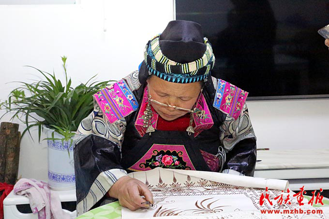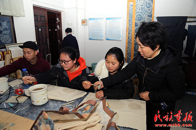 吳安麗老師在凱里學(xué)院藝術(shù)學(xué)院蠟染實(shí)訓(xùn)室指導(dǎo)學(xué)生