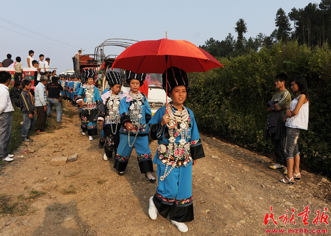 苗族送親隊(duì)伍來到新郎家的寨口,寨老為新娘主持“回喜神”儀式。楊昌垠,引自民族畫報(bào)