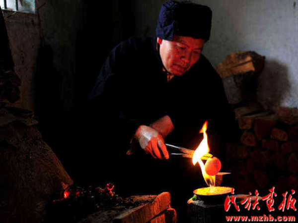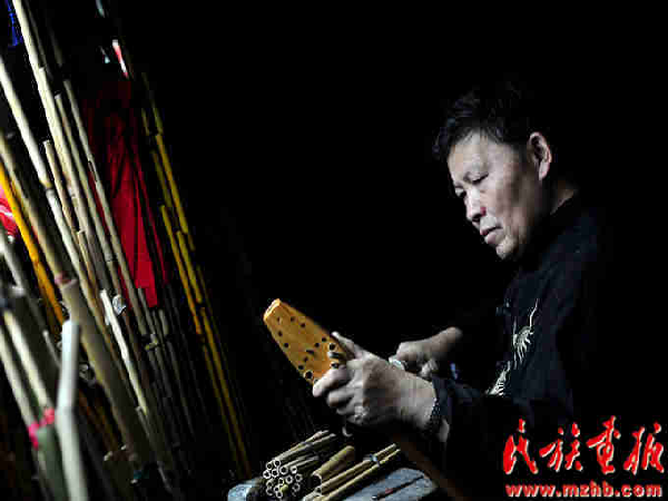 莫師傅在對兩個蘆笙進(jìn)行高低音的和諧調(diào)試