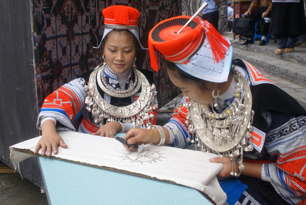 蠟染是貴州省丹寨縣、安順縣、織金縣苗族世代傳承的傳統(tǒng)技藝。 丹寨縣、安順縣及織金縣是以苗族為主體的多民族聚居區(qū),在長期與外界隔絕的艱苦環(huán)境中,這里的居民逐漸形成了自給自足的生活方式,古老的蠟染技藝因此得以保留下來。按苗族習俗,所有的女性都有義務(wù)傳承蠟染技藝,每位母親都必須教會自己的女兒制作蠟染。所以苗族女性自幼便學習這一技藝,她們自己栽靛植棉、紡紗織布、畫蠟挑秀、浸染剪裁,代代傳承。在此狀況下,這些苗族聚居區(qū)形成了以蠟染藝術(shù)為主導(dǎo)的衣飾裝束(以上三照片由劉軍提供)。
