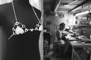龍?zhí)栔谱鞯摹般y飾胸罩”,去年4月被貴州省商務(wù)廳拿到英國參展。當(dāng)時,有英國朋友開價750英鎊(折合人民幣約7500元)購買,但被婉言謝絕。商務(wù)廳的工作人員說,這件作品是供大家欣賞、了解貴州文化的,不便出售。如今,這件作品被擺放在龍?zhí)柕淖鞣焕?,特別搶眼。