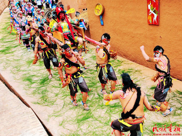 恭請(qǐng)大啞巴的儀式上,羅支全部到齊。羅支就是眾老啞巴,為首的被稱為畢摩。彩繪時(shí),以不同的圖案分別繪在臉部的右上方作為家族和輩分區(qū)別。儀式上,六位畢摩在護(hù)衛(wèi)總管的護(hù)衛(wèi)下,依次點(diǎn)香叩首。畢摩大聲喊“請(qǐng)啞巴出山嘍”。然后四個(gè)壯實(shí)的中啞巴用扎好的彩轎抬著大啞巴游街,其余啞巴打歌跟在后面。最為活躍的是畢摩的跟幫,也稱為“馬彷”,他們以倒退的方式,邊跳邊引導(dǎo)行進(jìn)的隊(duì)伍。啞巴隊(duì)從村頭到村尾,通過祭拜龍樹、祭鼓,經(jīng)過“三請(qǐng)三唱三起號(hào)”,將大啞巴請(qǐng)到廣場,隨后開始了具有濃厚文化底蘊(yùn)的啞巴舞表演。