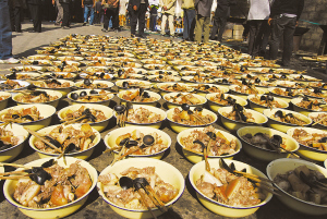 壩壩宴最能體現(xiàn)出金陽人的飲食文化。但要吃出味道,吃出氛圍,則大有講究。在形式上,吃飯聲勢要大,食客多多益善。在內容上,肉要多,平均每個人至少有5塊坨坨肉。如果不夠吃,辦酒的主人家就會覺得丟臉,別人也會有所議論。一般來講,一桌上一盆肉,8斤左右為宜。
