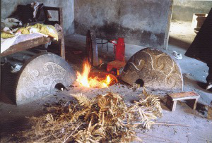 涼山彝族獨(dú)特的“鍋莊石” 。彝族的火塘為全家的生活中心,進(jìn)食、取暖、照明、會(huì)客、議事等都圍著火塘進(jìn)行。“鍋莊”由3塊石頭支撐,一般在房屋建成前就請(qǐng)石匠打造好鍋莊石。其石料選取沒有污垢而又無缺陷的青石,鑿成厚10厘米左右的變異扇形,上面刻有龍、火、日、月、魚、鳳等古樸傳神的浮雕圖案。日常生活中,一般在鍋莊“上方”(火塘里側(cè)至墻壁)設(shè)矮床。