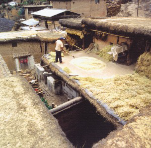土掌房屋頂 云南楚雄地區(qū)的土掌房,是土墻、土頂、外墻和底層無窗的兩層樓房。有的內(nèi)院也蓋屋頂,稱“無內(nèi)院式”。設(shè)天窗采光,屋頂還能當(dāng)曬臺(tái)。整個(gè)村落沿山坡而建,巷道很窄,遠(yuǎn)遠(yuǎn)望去,你家的屋頂是他家的院壩,只要上了一家屋頂,就能靠活動(dòng)的木梯自由往來。