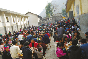 每年秋收后到翌年播種前,是四川涼山金陽縣人結(jié)婚的黃金季節(jié)。無論是在縣城還是農(nóng)村,不管是吃“九斗碗”,還是吃“坨坨肉”,大家都喜歡擺壩壩宴。在金陽縣城,常??梢钥吹竭@樣一幅景象:數(shù)百人聚在一處,圍坐于一張張方桌旁,伸箸暢食,舉杯暢飲。一盆盆肉端上桌子,主人不停地招呼客人趁熱吃?! ?/p>