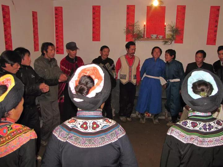 4、源自于搶婚習(xí)俗。以前,在彝區(qū)還有暴力阻攔或嘲弄接親人的習(xí)俗,這種習(xí)俗因搶婚相反,我們姑且稱之為攔婚習(xí)俗。何為攔婚?就是女方家就安排出嫁女素日的伙伴在接親隊來的路口守候著,當(dāng)接親隊來時,抑或用水澆潑接親人,抑或抓粘草籽撒在接親人身上,甚至用蕁麻抽打接人,讓接親人很是吃消不下,既痛苦又尷尬。這種習(xí)俗可能源自于古時的搶婚制度。古時,經(jīng)濟(jì)文化落后之時,禮儀制度還不健全,存在著搶婚的現(xiàn)象,女子無法主宰自己的命運,被當(dāng)作財產(chǎn)和工具被男人搶奪。隨著禮儀制度的興起,女子的自我意識和維權(quán)意識有了增強(qiáng),她們內(nèi)心深處極力反對婚姻壓迫和搶奪,希望與男子取得平等的待遇。于是就開始出現(xiàn)了阻攔和戲弄接親人的習(xí)俗。阻攔和嘲弄接親人的方式多種多樣,也從最早的野蠻方式逐步向文明過渡。應(yīng)該說,阿買懇是攔婚習(xí)俗的延伸與發(fā)展,又折射出了搶婚的影子。阿買懇設(shè)置了幾十道盤歌的關(guān)卡,每道關(guān)卡都需要智慧和才藝,這是一種傳統(tǒng)習(xí)俗繼承中的文明發(fā)展表現(xiàn)。“阿買懇”的“懇”,除上面講的有“跳舞”、“歌舞”之意外,還有“搶”、“奪”之意。綜上所述,阿買懇蘊(yùn)含了搶婚制中深層次的文化心理積淀。