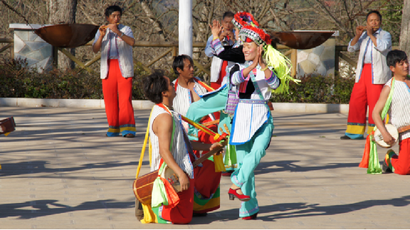 大三弦舞又叫“阿細(xì)跳月”,流傳于云南撒尼和阿細(xì)民間的一種舞蹈。據(jù)傳大三弦舞來(lái)源于刀耕火種時(shí)代。跳這種舞時(shí),男子一字排開(kāi),彈著三弦或吹著笛子跳。隨著節(jié)奏抬腳踢腿,向前退后、向左向右交換舞步。女青年亦一字排開(kāi),腿上的動(dòng)作與男青年一致。不同的是女青年要拍手,原地跳一段節(jié)奏,由左向右轉(zhuǎn)一個(gè)圈,輪回反復(fù)。有時(shí)男子向前沖,女子向后退,富有情趣。