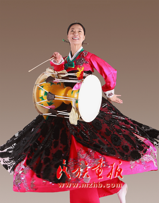 長(zhǎng)鼓舞和象帽舞其實(shí)都源于傳統(tǒng)的農(nóng)樂(lè)舞。早先,長(zhǎng)鼓舞是農(nóng)樂(lè)舞的一個(gè)部分,20世紀(jì)初,由于其獨(dú)特的舞蹈形態(tài),長(zhǎng)鼓舞從農(nóng)樂(lè)舞中脫穎而出,成為一種獨(dú)立的民間舞蹈,備受朝鮮族群眾的喜愛(ài)。舞臺(tái)上,那腰掛火紅長(zhǎng)鼓的姑娘一道明媚的眼神、一個(gè)華麗的轉(zhuǎn)身,都引得觀者癡癡凝望;那一陣緊似一陣、一聲響似一聲的敲擊,聲聲清脆,直撞你的心房,令你目眩神迷、心旌搖蕩!