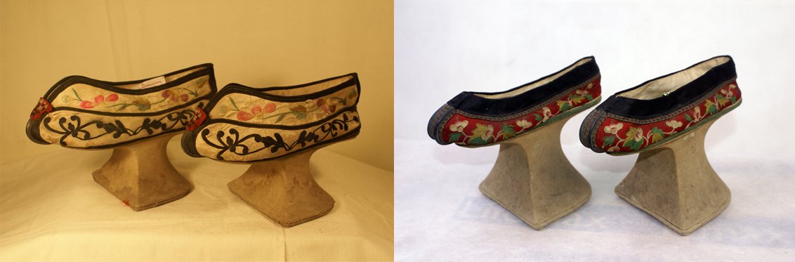 “旗鞋”款式獨(dú)特,是一種高木底繡花鞋,又稱(chēng)“高底鞋”“花盆底鞋”“馬蹄底鞋”等。其木底高跟一般高5-10厘米,最高可達(dá)25厘米。一般用白布包裹,然后鑲在鞋底中間腳心部位。跟底形狀通常有兩種,一種上敞下斂,呈倒梯形花盆狀。另一種是上細(xì)下寬、前平后圓,其外形及落地印痕皆似馬蹄?!盎ㄅ璧住焙汀榜R蹄底”鞋由此得名。除鞋幫上飾以蟬蝶等刺繡紋樣或裝飾片外,木跟不著地的部分也常用刺繡或串珠加以裝飾。有的鞋尖還飾有絲線編織的穗子。這種鞋的高跟木底極為堅(jiān)固。