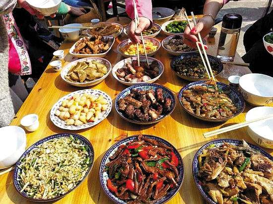 蔬菜大多制成酸萊。魚鮮包括鯉魚、鯽魚、草魚、鱔魚、泥鰍、小蝦、螃蟹、螺螄、蚌之類,可制成火烤稻花鯉、草魚羹、鮮炒鯽魚、吮棱螺、酸小蝦、酸螃蟹等風(fēng)味名肴。肉品主要是豬、牛、雞、鴨肉,吃法與漢族差別不大。瓜果有刺梅、獼猴桃、烏柿、野楊梅、野梨、藤梨、飽飯果、刺栗、大王泡,以及松村嫩皮、桑樹嫩皮、香草根等。其中,櫟木的果實(shí)可做成豆腐,“香樹”的皮可潔白牙齒,油茶樹上長的“茶泡”是天然的酸甜汁。野味包括鼠、蛇、蝌蚪、四腳蛇、幼蟬、幼蝗、土蜂蛹、石蛙、穿山甲、囡囡魚,以及吃松果長大的松香雞和松香豬,侗族均能巧加利用。菌耳方面有松菌和鮮美的雞絲凍菌,還有可制粑粑與粉絲的藤根、葛根,水田生長的細(xì)微苔絲,隨處可見的竹筍。飲料主要是家釀的米酒和“苦酒”,以及茶葉、果汁。據(jù)粗略估計(jì),侗族的常見食料不少于五百種,天上飛的,水里游的,地上長的,草中爬的,只要能吃,無不取食。顯示出他們的聰明才智和很強(qiáng)的生存適應(yīng)能力。