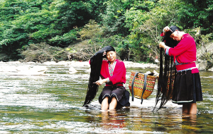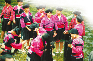 紅瑤女子的長發(fā)平均在1.4米以上。村寨前后的河灘邊、泉水邊,就是她們的天然梳妝臺(tái)