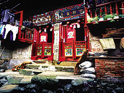 狹長式的房屋大都建在深山里幾十戶大小的村寨。面闊一間并開正門,室內(nèi)隔間向縱深排列,從正門到后門有7道門之多。正門是大門也是第一道門,是家族的門面,被視為招財進寶和迎接貴客之門。對開門扇高大厚實,門檻上又設(shè)兩扇雕刻彩繪的矮門,天熱開大門通風(fēng)時,可以防止禽畜入戶。大門兩側(cè)掛有木刻大字對聯(lián),大門墻面的屋檐下則畫有七彩畫卷。