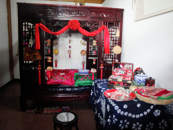白族婚禮一般要舉行四天,第一天叫“預(yù)喜”,主要是殺豬宰羊,搭彩棚,迎喜神,接月老以及布置客堂、洞房和貼對聯(lián)等。第二天為“正喜”,嗩吶高奏,鑼鼓喧天,或騎馬或坐轎,迎親隊伍浩浩蕩蕩到女方家迎新娘,在完成了一系列妙趣橫生的禮儀后,經(jīng)媒人再三催請后,新娘才依依不舍,由其親兄長背出門。新娘迎出門外后,新姑爺還要專門返回給丈母娘磕頭拜別,意為“回馬謝親”。新娘進門時要跨火盆或馬鞍,表示興旺或平安,有人還要故意在火盆里灑上辣椒面,嗆得大家流淚,白語里“辣”叫“qil”,與“親”諧音,表示以后親親密密。新娘迎進門后,拜堂前要梳妝,即女子換頭禮,請年高婦女為新婦梳頭,先戴鳳冠,然后換成紗帕,腳踩裝滿糧食的斗,寓意五谷豐登,魁星踢斗。斗中擺一桿秤,寓意新娘心像秤一樣公平,對丈夫?qū)Ω改敢灰曂剩址胖靡话鸭舻?,表示新娘對愛情的忠貞不二。第三天回門。新娘清晨早起,在別人幫助下“收頭”,將頭發(fā)梳成高高的髻,作為成人的標(biāo)志,然后由新郎陪同回娘家。新娘手中提著一籃糖果,有花生、瓜子、水果糖之類,路上遇到熟人和小孩,就抓給一把。這天新娘家要辦酒席招待女婿,女婿一一拜見岳家長輩,新婚夫婦當(dāng)日返回男家。第四天酬客,折彩棚,招待幫忙的客人。