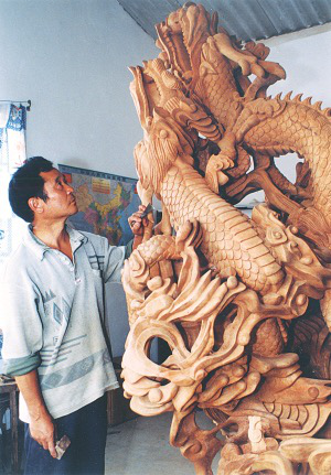 今年54歲的李元生,以雕龍而遠(yuǎn)近聞名。早在上個世紀(jì)80年代初,他創(chuàng)作的第一件根(木)雕作品《困龍也有上天時》,便被一位游客購買收藏。在近20年的時間里,一些常人眼里只能當(dāng)柴燒的樹根,在他獨(dú)特的構(gòu)思和飛舞的刻刀中,變成了上百件大小不一的富有生命力的根(木)雕作品。其中的代表作有:《九龍傳說》、《送子觀音》、《長壽九千年》、《金龍獻(xiàn)寶》、《哪吒鬧?!贰ⅰ叮保梗梗埂伺c自然》等。這些作品,不少被省內(nèi)外的單位和個人作為珍品收藏。