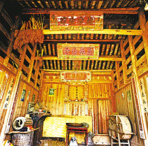 湖南省永順縣麻岔鄉(xiāng)司城村吊腳樓里掛著匾額的堂屋
