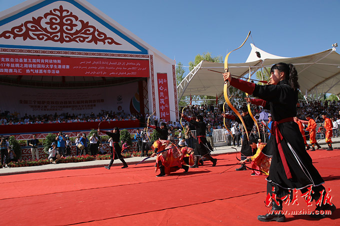 射箭是游牧民族在過去的游牧生活中必會(huì)的生存本領(lǐng)之一,哈薩克族的射箭也是傳統(tǒng)的體育競技項(xiàng)目。圖為阿克塞之鷹2017年絲綢之路騎射國際大學(xué)生邀請(qǐng)賽上,學(xué)生的射箭展示