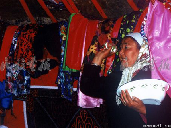 新婚喜宴開始的時(shí)候,客人先按照哈薩克人的習(xí)慣洗手,用主人準(zhǔn)備的毛巾擦手,然后,按年齡的長(zhǎng)幼圍坐在地氈上。主人把油炸的包爾沙克,香噴噴的手扒肉,色、香、味俱全的抓飯一盆接一盆地端來。吃完這些,大盆的肉湯或馬奶端到客人面前。哈薩克人對(duì)馬奶有著特殊的感情,他們喝完一碗又一碗,興高采烈,眉飛色舞。