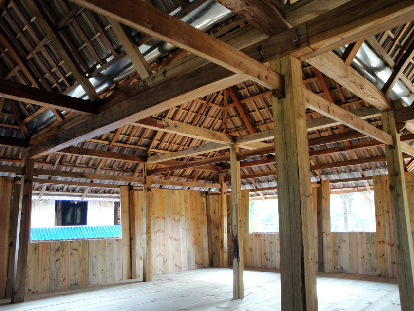 德宏瑞麗一帶的竹樓由“干欄”和平房?jī)刹糠纸M成,“干欄”是住房,平房是廚房?!案蓹凇倍酁殚L(zhǎng)方形,下層架空,可堆放雜物。上層做橫向分割,成一間堂屋和數(shù)間臥室。堂屋中設(shè)有火塘,一般用于燒茶,在一角設(shè)有佛龕。堂屋外有開敞的前廊和曬臺(tái)。屋頂為歇山式,脊長(zhǎng),坡面平緩,外墻開窗,有的還是落地窗,墻與屋頂之間有縫隙,這些都加強(qiáng)了室內(nèi)空氣的流通,達(dá)到了室內(nèi)陰涼的效果。