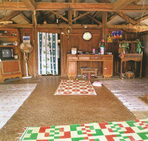 云南瑞麗的傣族民居。瑞麗的傣族民居是二層的竹樓,竹編外墻是利用竹皮正反面的紋理和光滑粗糙面編織的,從檐下垂直到底,均勻的縫隙透光通風,在強光照射下,其多變的幾何圖案更突出了工藝技巧和干欄式建筑的整體美感。屋面脊長,出檐短,大都用鍍鋅瓦楞鐵板替代草頂。樓層四壁以竹篾板封閉,開尺許小窗。外附短柱作下層重檐的斜撐,四周再加一圈矮柱,與墻面斜撐配。