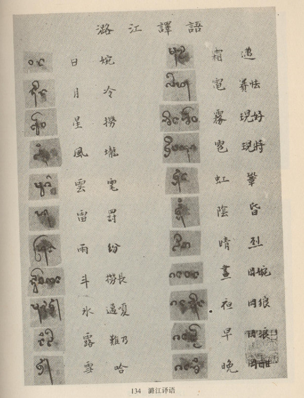 清代華夷譯語之一種,為云南潞江一帶當(dāng)時流行的傣文。此為原件之修補(bǔ)本。橫寬23厘米,高30厘米,共31頁。這種文字形體以傣哪文為基干,又帶有傣繃文的書寫特點(diǎn)。此修補(bǔ)本現(xiàn)存中央民族學(xué)院圖書館。