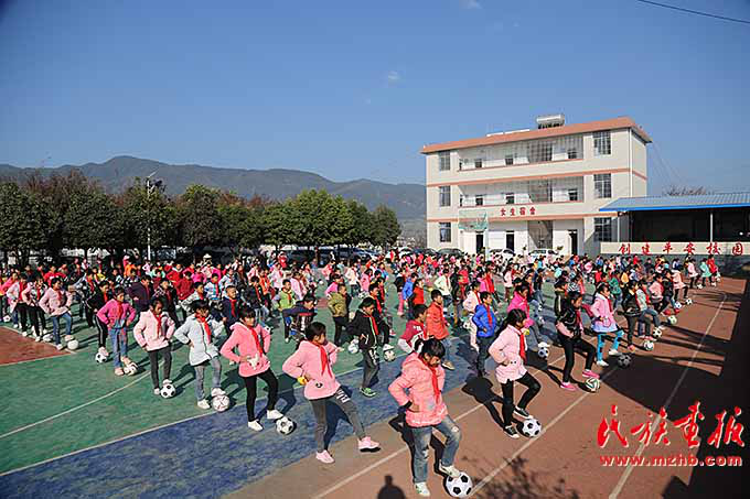 早晨,學生們歡快地沖出教室,每人手捧足球,在老師統(tǒng)一的號令下跳起了足球課間操