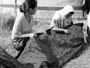 柯?tīng)柨俗巫迮藥缀醵紩?huì)刺繡。今年21歲的瑪利亞還是七八歲的小女孩時(shí),就捏著小繡針,跟著媽媽學(xué)繡藝。最先學(xué)的多是幾何形狀,媽媽畫(huà)好了紋樣,是一排整齊的尖角向上的三角形,告訴她,這是山,是喀拉塔格山,是父親和哥哥放牧的地方。瑪利亞便沿著那些三角形的邊緣密密地縫著,好像父親和哥哥的平安,與她的小手相關(guān)似的。