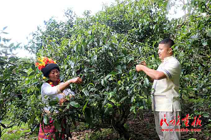 巖叫上夫婦在茶園采茶。