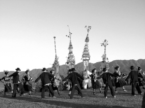 登窩羅時(shí),領(lǐng)唱的人在前,這人叫“稍干”。其他人雙手叉腰,跟著稍干唱。邊唱邊大蹲大跳,一會(huì)兒背對(duì)背,一會(huì)兒面對(duì)面。春節(jié)圍著窩羅牌坊跳,平時(shí)圍著一張擺滿煙酒茶果的桌子跳,意思是圍著太陽(yáng)、月亮轉(zhuǎn)。