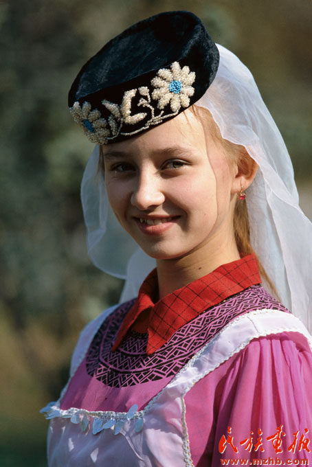 塔塔爾族的婚俗別具一格。按塔塔爾人的傳統(tǒng)習慣,婚禮在新娘家舉行,即先把新郎“嫁”出去,然后再“娶”回來。婚姻過程主要經(jīng)歷提親、相親、訂婚、納聘、嫁新郎、娶新娘六個過程(塔塔爾族少女。引自民族畫報)。
