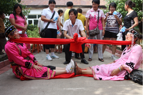 鄂倫春族特別喜歡體育活動,每當(dāng)狩獵閑暇的時候,便會開展各項體育比賽活動。兩三個人在一塊平地上,拿出一根皮繩就可以進行跳繩比賽;在河邊撿起石頭就可以進行投擲比賽;跳到河里又可以進行游泳比賽。他們也很樂于進行力的較量,摔跤,鄂倫春語稱“娟滴任”,這是獵人們普遍喜愛的一項運動,常勝者會贏得人們的贊賞和姑娘的青睞。還有一種較力比賽,鄂倫春語稱“譚滴任”,俗稱“拽棍”。兩人相對坐在地上,雙手緊握一根約半米長的木棍,雙腳平伸雙足相抵。比賽開始,雙方拼力拽拉木棍,將對方拉起來為勝。
