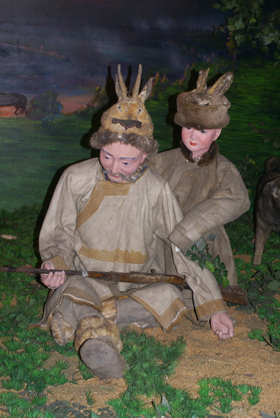 狩獵經(jīng)濟在鄂倫春族社會中維持了幾千年,一人一匹獵馬一桿槍,再加上幾條獵狗和一片獵場,幾乎就是鄂倫春族的全部生產(chǎn)力。而槍支的傳入也不過才300多年的歷史,在此之前使用石塊和木棒狩獵,后來發(fā)明了扎槍和弓箭,與外界幾乎隔絕,純粹的食獸肉、衣獸皮。鄂倫春族最早使用的獵槍是被稱做“俄羅斯鳥槍”的火槍,這是清朝的察邊官吏、外民族及俄國商人交換給他們的。有火繩槍、火鐮槍和泡子槍三種,都是從槍筒裝入火藥或鉛彈,只是引爆方式不同。民國以后陸續(xù)傳入俄國造的連珠式和“三八”式、“七九”式等現(xiàn)代步槍。槍支的傳入,使鄂倫春人有了剩余產(chǎn)品,于是出現(xiàn)了交換經(jīng)濟。每年五月的“楚勒罕”集會時,鄂倫春、鄂溫克、達斡爾等狩獵民族要向清廷貢貂,經(jīng)朝廷官員檢驗,不合格者可以在集會上進行互市。此時,他們也帶一些其他的獵產(chǎn)品及手工藝品進行交換。由于鄂倫春人所貢貂皮質(zhì)量最好,故朝廷對他們采取了特別的納貂辦法:每年派一名專職人員到鄂倫春地區(qū)代表官府征收貂皮、發(fā)放賞賜。這些專職人員被稱為“諳達”,他們代表官府征收貂皮的同時,也自帶一些糧食、布匹和其他生產(chǎn)、生活用品與鄂倫春人進行私下交換。后來,“諳達”變成了泛指進山進行獵產(chǎn)品收購生意的所有商人?!爸O達”與鄂倫春人進行交換時從不計價,而是以“馬馱”為計量單位,雙方以同樣一馬馱的物品進行互換,或者采取包干制的辦法,一個“諳達”固定幾個包攬戶,按期供給他們生產(chǎn)和生活必需品,包攬戶將所有的剩余產(chǎn)品交于“諳達”。隨著貨幣經(jīng)濟的發(fā)展,清末時期,鄂倫春族周邊地區(qū)出現(xiàn)了眾多商號商鋪,這些商號(鋪)的老板被稱為“老客”,他們同鄂倫春人進行計價交換。同時還出現(xiàn)了一些進行計價交換的行商,被稱為“跑老客”。鄂倫春人雖然受到“諳達”、老客和跑老客的瘋狂欺詐和層層盤剝,但在與他們的交換中,卻自覺或不自覺地打開了封閉的自然經(jīng)濟大門,朝著商品經(jīng)濟邁進了一步(鄂倫春博物館展覽攝影:劉軍)。