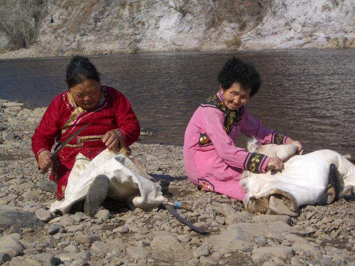 鄂倫春人過(guò)去在家庭公社“烏力鄰”里,同生產(chǎn)共消費(fèi),在當(dāng)時(shí)生產(chǎn)力十分低下的情況下,憑著扎槍和弓箭,單個(gè)人很難獲得能夠滿足衣食需要的獵物,必須要有“烏力鄰”全體成員的通力合作,才能戰(zhàn)勝兇猛和龐大的野獸,所以,在“塔坦達(dá)”領(lǐng)導(dǎo)下的集體狩獵是當(dāng)時(shí)最主要的勞動(dòng)形式。隨著生產(chǎn)力的不斷發(fā)展和個(gè)體小家庭的大量流動(dòng),不僅社會(huì)組織“烏力鄰”由原來(lái)血緣性的家庭公社演變?yōu)榈鼐壭缘牡赜蚬?,勞?dòng)組織也隨之發(fā)生了極大的變化。集體狩獵已不再是“烏力鄰”傾巢出動(dòng),而是由幾個(gè)小家庭的成員自愿結(jié)合成“安嘎”來(lái)進(jìn)行。同時(shí)還出現(xiàn)了集體和個(gè)人等多種勞動(dòng)形式。狩獵也不再單純是為了滿足衣食的需要,剩余獵物可以拿去交換,獵產(chǎn)品已趨于商品化。故此時(shí)一些珍貴的細(xì)毛皮張和藥用價(jià)值較高的獸類,成了鄂倫春人主要的狩獵目標(biāo)。這樣就形成了一年中的四個(gè)狩獵旺季,即:農(nóng)歷正月至2月是“鹿胎期”;4月至6月是“鹿茸期”;9月至落雪為“叫鹿尾期”;落雪后至來(lái)年開(kāi)春是“打皮子期”。大概是源于原始的圍獵,鄂倫春人把狩獵叫“打圍”,而這四個(gè)狩獵旺季就叫“紅圍期”?!凹t圍期”除“叫鹿尾期”外,都組織“安嘎”集體出獵?!鞍哺隆笔且环N臨時(shí)性的狩獵組織,狩獵旺季將臨時(shí),由一人發(fā)起,串聯(lián)幾位親朋好友或志趣相投的人組成一個(gè)“安嘎”,待獵期結(jié)束,“安嘎”自行解散,下次出獵時(shí)再重新組合,因此其成員并不是固定的(圖為熟化狍皮,吳雅芝攝影)。