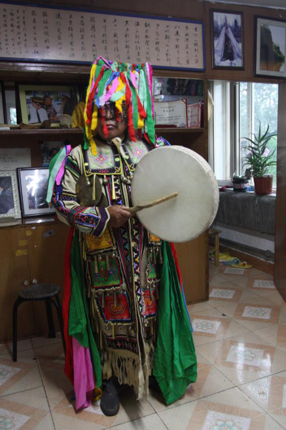 冬天穿的鞋是“奇哈密”和“溫得”,“奇哈密”是用狍脖皮或犴皮做靴底,用狍腿皮拼縫成靿的短靴?!皽氐谩笔怯寐够蜥砥ぷ龅?,鹿或犴腿皮拼縫成靿的長(zhǎng)靴?!皽氐谩币?yàn)殪壐?,冬天穿著打獵不易灌雪。這兩種靴子都要用冬季絨毛狍皮做成的襪子配套穿用,暖和跟腳,踩在雪地上沒(méi)有聲響。夏天一般穿“奧勞其”,是一種皮底布靿短靴?!翱己袈洹保怯枚窘q毛狍皮縫制的二指手套,掌面腕部留一縫口,手從縫口中伸出,手套仍護(hù)在手背上,既使在零下40度的嚴(yán)寒中處理獵物,也不用擔(dān)心手被凍壞。還有一種五指狍皮手套,背面正中繡花、蝶等中心圖案,五指的關(guān)節(jié)和指甲處繡出各種小型圖案,然后用連理枝將中心圖案和關(guān)節(jié)、指甲圖案連為一體,中心圖案代表手掌,手指圖案代表關(guān)節(jié)和指甲,連理枝代表骨骼和血脈(圖為越來(lái)越鮮見(jiàn)的薩滿服飾,吳雅芝供圖)。