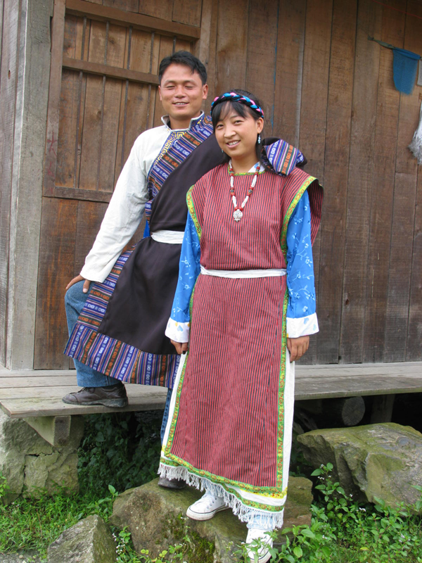 門隅地區(qū)的男女都喜愛用羊毛織品氆氌為原料,穿氆氌袍和絳紅色的長袍,腰間系一條赭色腰帶;女子內(nèi)衣以棉織...
