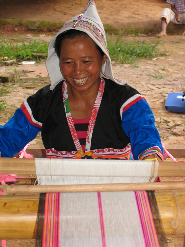 基諾族織錦色線的染色工藝有其獨(dú)特之處。染黑(青)布,采“咪叭”(即板藍(lán)根)鮮葉泡化去渣,加入石灰水?dāng)嚢璩浞趾蟿?,煮水,把布投入水中翻?dòng)多次,撈出曬干即可,煮泡越透色越深。若染青色,只要浸泡一會(huì)即可。染黃線,采“合詩阿波”花(鼠鞠草)與線同煮即可。染綠色,采一種藤“阿紐克帕”和一種樹“資奪帕”的鮮葉與線同煮,加石灰水少許即可。染紅線,用“阿納切”樹根、“樸臘突”樹皮和紅高粱殼,加石灰水與線同煮即可。