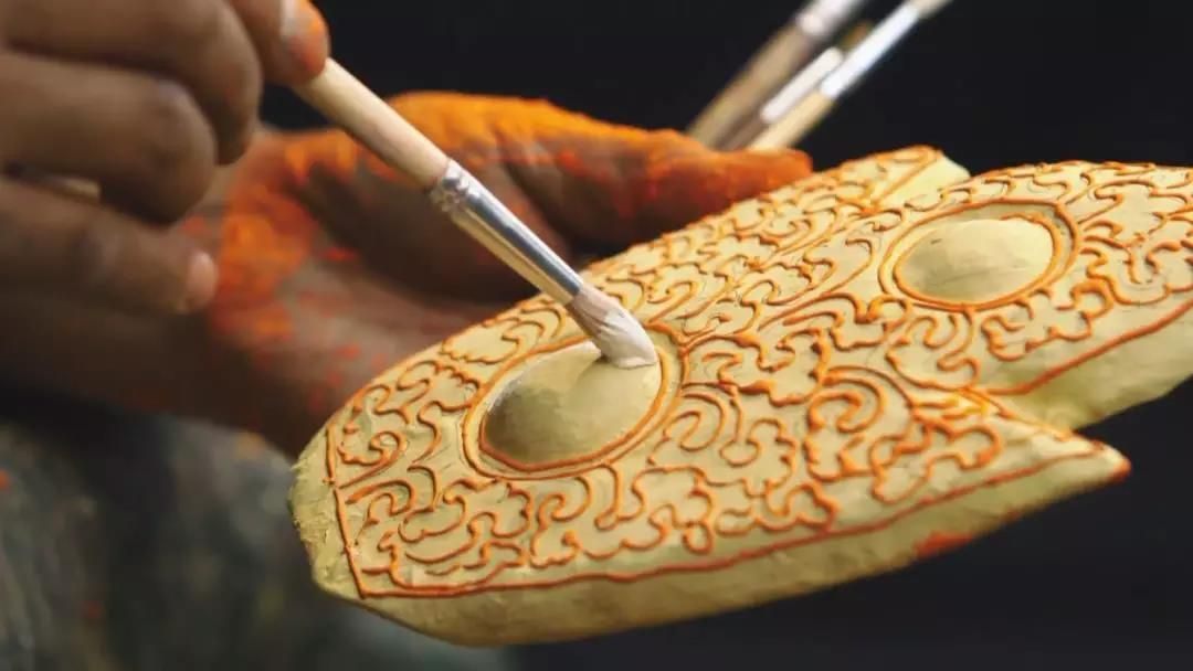 在等待膠布面具晾干的時候,扎西去到了兒子練習(xí)跳舞的地方,在外面遠(yuǎn)遠(yuǎn)的看著兒子練舞。原本希望兒子繼承他這手藝的心思,在看到兒子真心喜歡藏舞后,也被漸漸放了下來?;氐郊抑?,膠布面具已經(jīng)干透,開始了制作面具中最重要的一環(huán):上顏色。隨后上頭發(fā)、簪子等小零件,一個薩迦面具終于制作完成。