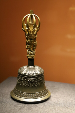 持驗(yàn)法器單元主要展示修持佛法、舉行佛事活動和佛教儀式時(shí)所用的法器,包括金剛鈴、金剛杵、嘎巴拉碗、嘎巴拉鼓、嘎巴拉念珠、喀章嘎、金剛橛、鉞刀等。本部分所選法器多為藏傳佛教密宗修行所用,因多存于庫房,已不在原佛堂陳設(shè),其用途和使用場所便難以知悉。故宮中有許多佛堂,大多是乾隆時(shí)期建造,其中很多是密宗佛堂,如雨花閣、梵華樓、梵宗樓、養(yǎng)心殿西暖閣佛堂等。