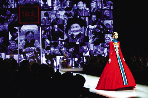 在活動現(xiàn)場,隨著一曲旋律優(yōu)美、委婉動聽的布依歌謠《穿上阿媽的繡花衣》,4位布依族繡娘唱著古老的歌謠走進(jìn)秀場。她們安靜地坐在舞臺上飛針走線,以嫻熟的繡藝做起了日常的針線活。45套以中國刺繡元素為設(shè)計(jì)靈感的EVE CINA時裝、24套國金黃金股份有限公司專題設(shè)計(jì)的中國元素配飾逐一呈現(xiàn)在觀眾面前。秀場上演了一場東方時裝之美的視覺盛宴。