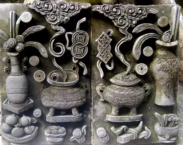 在藝術(shù)上,磚雕遠近均可觀賞,具有完整的效果。在題材上,磚雕以龍鳳呈祥、和合二仙、劉海戲金蟾、三陽開泰、郭子儀作壽、麒麟送子、獅子滾繡球、松柏、蘭花、竹、山茶、菊花、荷花、鯉魚等寓意吉祥和人們所喜聞樂見的內(nèi)容為主。在雕刻技法上,主要有陰刻(刻劃輪廓,如同繪畫中的勾勒)、壓地隱起的淺浮雕、深浮雕、圓雕、鏤雕、減地平雕(陰線刻劃形象輪廓,并在形象輪廓以外的空地鑿低鏟平)等。民間磚雕從實用和觀賞的角度出發(fā),形象簡練,風(fēng)格渾厚,不盲目追求精巧和纖細,以保持建筑構(gòu)件的堅固,能經(jīng)受日曬和雨淋。
