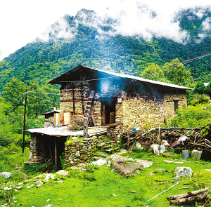 房屋大都是3層,上層存放干草和秸桿,下層關養(yǎng)牲畜,中間一層是居室。居室用木板隔間,里間較小是已婚子女住的,外間寬敞,是多功能堂屋。臨窗處設火塘,以利排煙,是家庭生活中心和待客之處?;鹛辽霞苤T大的鐵三角架,上面是六七厘米寬的鐵板圈,擦得錚亮,能烤制食物。墻角處供奉佛像,擺放領袖像。房門安設木鎖,用十幾厘米的木鑰匙開啟,都是由硬木刻制,光滑耐用。