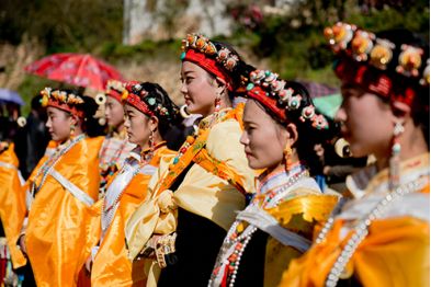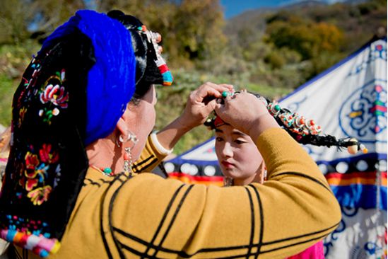 盤好發(fā)髻,佩戴好頭飾,在肩、背系好五彩哈達(dá)后,由本村具有威望的女性長(zhǎng)者引領(lǐng)來(lái)到儀式現(xiàn)場(chǎng)。法號(hào)聲中,煨桑的青煙裊裊升起,威嚴(yán)的活佛主持誦經(jīng)祈福儀式。隨后,德高望重的長(zhǎng)者為參加儀式的女子送祝福茶,長(zhǎng)輩為姑娘們獻(xiàn)哈達(dá)。一系列儀式結(jié)束后,無(wú)論男女老少,都來(lái)到場(chǎng)地中央,踏歌起舞,跳起吉祥的鍋莊。