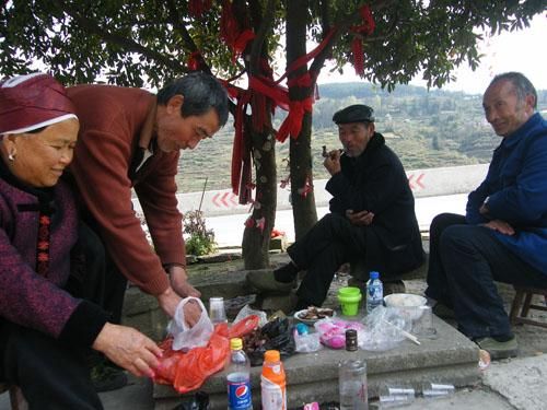 圖為苗族老人在“保樹”前擺放酒食開展祭祀