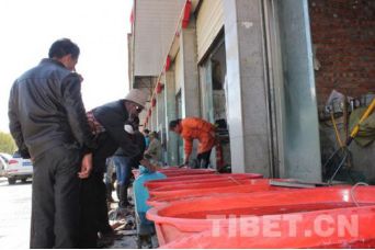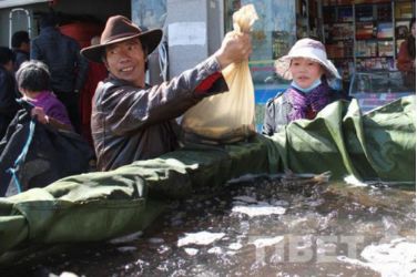 在當(dāng)?shù)厮幫跎睫r(nóng)貿(mào)市場可以看到,很多信眾或帶著器皿或拿著塑料口袋前往水產(chǎn)店買魚放生。甚至有的信眾開著一輛面包車,車廂用塑料包裹,里面裝滿水,載著買來的一整車魚前往拉薩河放生。 “薩嘎達瓦節(jié)期間,魚賣的特別快,藏歷十五的時候我們的魚都被買光了?!彼a(chǎn)市場的李老板說。