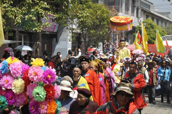農歷二月初六,迎太子入城。這一天在佛教徒的帶領下,人們焚香沐浴,衣冠整齊,虔誠地將“太子”(用布扎油漆制成的太子行像)請到行宮或本主廟里。這一年的新郎為太子抬轎,希望能得到太子的保佑而使新婚的妻子孕生男兒。
