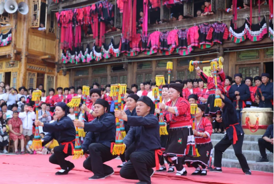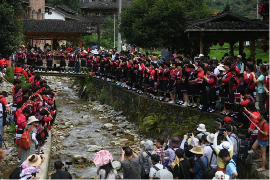 曬衣節(jié)當天還進行了嗩吶鑼鼓迎賓、瑤嫂長發(fā)梳妝展示、“抬金狗”送祝福、紅瑤服飾加工展示、紅瑤集體婚禮等活動,豐富多彩的民俗文化、濃郁的民族風情,讓各地游客流連忘返。