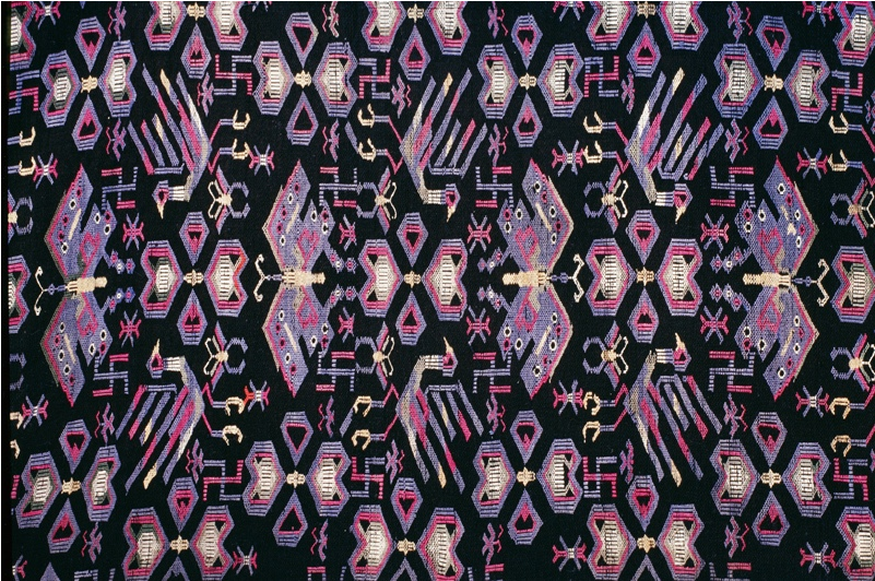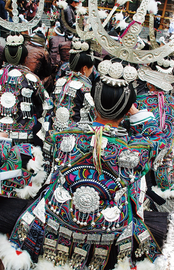 亳無疑問,蝴蝶圖騰即是對蠶的崇拜,蠶文化原初的核心便是人歸途的儀式,人要在這種和蠶一祥的儀式中得到再生。今天的苗族,仍然保持著以絲綢裹身而葬的喪葬習俗。我祖母養(yǎng)蠶織就的絲織品,我們習慣稱作蠶絲床單,絕大部分是備著喪葬所用。凡有人去世,主客必送一床蠶絲單,沒有是不行的,被視為不懂禮節(jié),而死者獲得蠶絲單越多越好。有的人家收到的蠶絲單過多,就會保存一部分,留著將來的喪事送禮。苗族每個人都必備一件絲質壽衣。并且,在許多重大的儀式活動中必須要著絲綢服裝。比如在苗族重大的鼓藏節(jié)期間,鼓社頭必須穿絲織鼓社服;大祭典活動時,祭師也必須穿絲質服裝等等。
